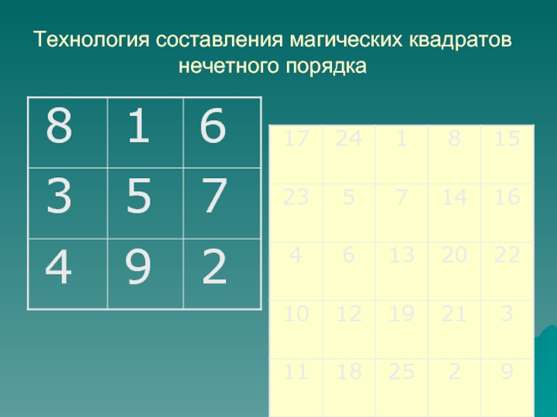 Слайд 14Технология составления магических квадратов нечетного порядка