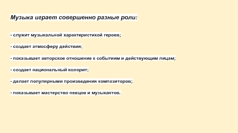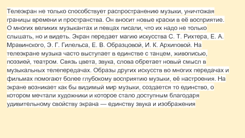 Он вносит новые краски в её восприятие. О многих великих музыкантах и певцах писали, что их надо не только слышать, но и видеть. Экран передает магию искусства С. Т. Рихтера, Е. А. Мравинского, Э. Г. Гилельса, Е. В. Образцовой, И. К. Архиповой. На телеэкране музыка часто выступает в единстве с танцем, живописью, поэзией, театром. Связь цвета, звука, слова обретает новый смысл в музыкальных телепередачах. Образы других искусств во многих передачах и фильмах помогают более глубокому восприятию музыки, её настроения. На экране возникает как бы видимый мир музыки, создается то единство, о котором мечтали художники и которое стало доступным благодаря удивительному свойству экрана — единству звука и изображения
