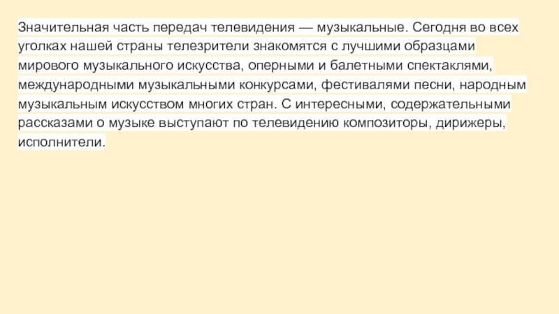 Значительная часть передач телевидения — музыкальные. Сегодня во всех уголках нашей