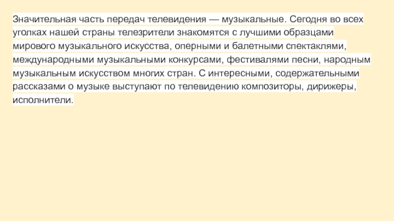 Значительная часть передач телевидения — музыкальные. Сегодня во всех уголках нашей