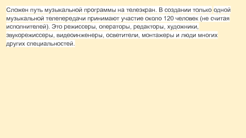 телепередачи принимают участие около 120 человек (не считая исполнителей). Это режиссеры, операторы, редакторы, художники, звукорежиссеры, видеоинженеры, осветители, монтажеры и люди многих других специальностей.