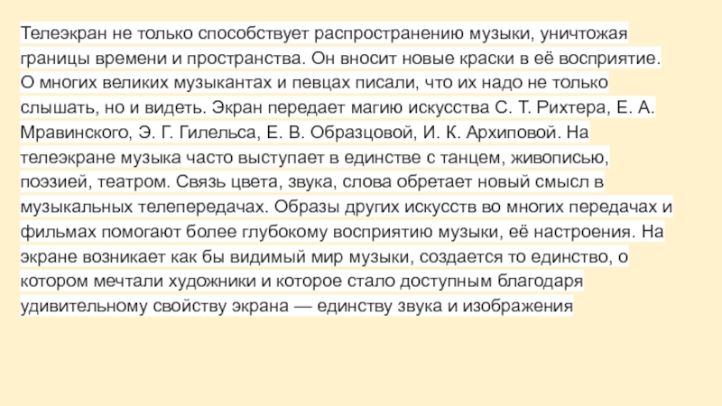 Он вносит новые краски в её восприятие. О многих великих музыкантах и певцах писали, что их надо не только слышать, но и видеть. Экран передает магию искусства С. Т. Рихтера, Е. А. Мравинского, Э. Г. Гилельса, Е. В. Образцовой, И. К. Архиповой. На телеэкране музыка часто выступает в единстве с танцем, живописью, поэзией, театром. Связь цвета, звука, слова обретает новый смысл в музыкальных телепередачах. Образы других искусств во многих передачах и фильмах помогают более глубокому восприятию музыки, её настроения. На экране возникает как бы видимый мир музыки, создается то единство, о котором мечтали художники и которое стало доступным благодаря удивительному свойству экрана — единству звука и изображения