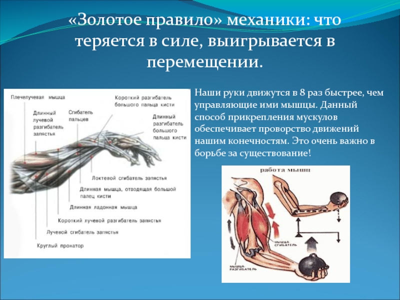 движутся в 8 раз быстрее, чем управляющие ими мышцы. Данный способ прикрепления мускулов обеспечивает проворство движений нашим конечностям. Это очень важно в борьбе за существование!