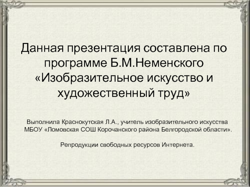 Данная презентация составлена по программе Б.М.Неменского «Изобразительное искусство и художественный труд»