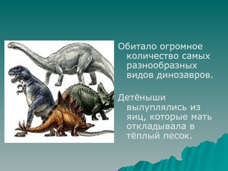Обитало огромное количество самых разнообразных видов динозавров.