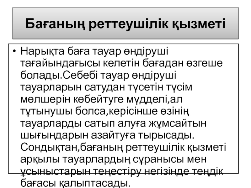 Слайд 3Тауарлардың бағасы басқару құралы ретінде түрлі қызметтерді атқарады: