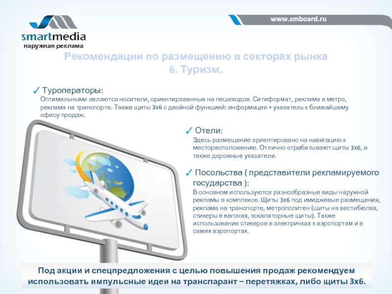 Под акции и спецпредложения с целью повышения продаж рекомендуем использовать импульсные идеи на транспарант – перетяжках, либо щиты 3х6.