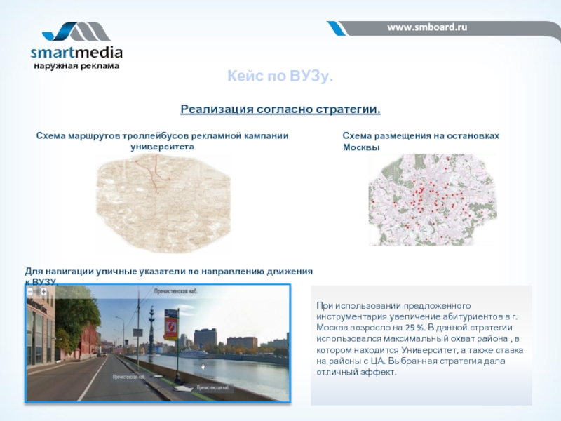 При использовании предложенного инструментария увеличение абитуриентов в г. Москва возросло на 25 %. В данной стратегии использовался максимальный охват района , в котором находится Университет, а также ставка на районы с ЦА. Выбранная стратегия дала отличный эффект.
