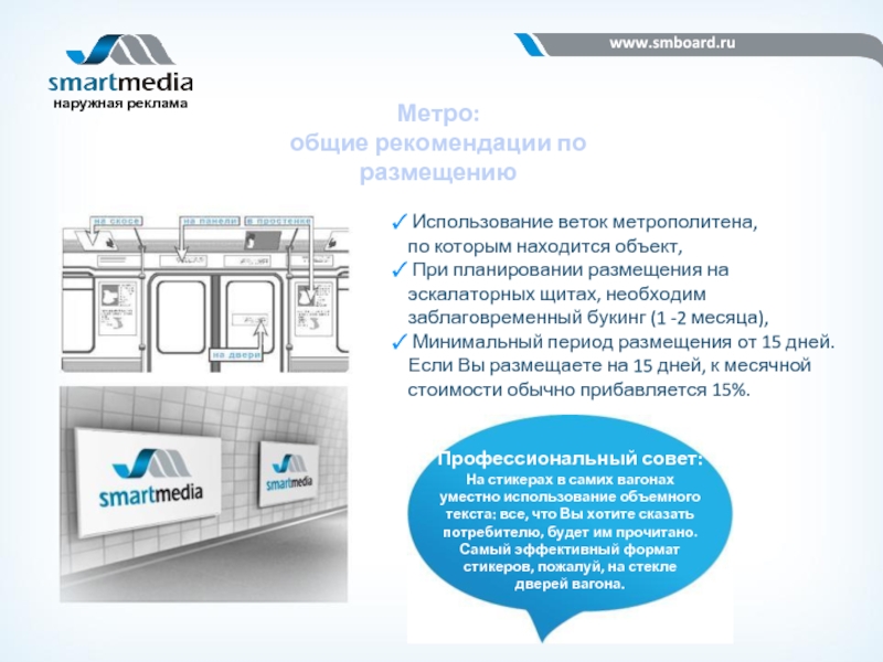 На стикерах в самих вагонах уместно использование объемного текста: все, что Вы хотите сказать потребителю, будет им прочитано. Самый эффективный формат стикеров, пожалуй, на стекле дверей вагона.