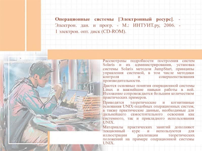 Приводятся теоретические и когнитивные основания UNIX-подобных операционных систем, а также практические данные, необходимые для дальнейшего самостоятельного освоения как системного, так и прикладного использования UNIX.