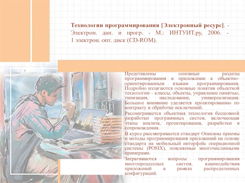 Подробно излагаются основные понятия объектной технологии – классы, объекты, управление памятью, типизация, наследование, универсализация. Большое внимание уделяется проектированию по контракту и обработке исключений.