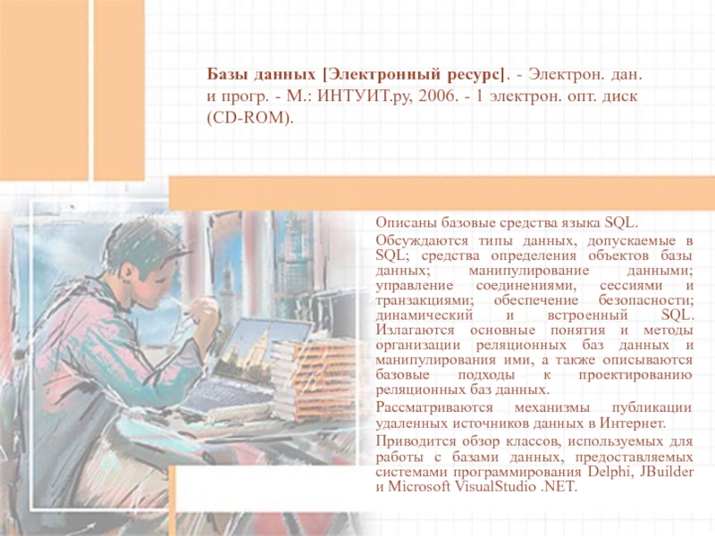 Приводится обзор классов, используемых для работы с базами данных, предоставляемых системами программирования Delphi, JBuilder и Microsoft VisualStudio .NET.