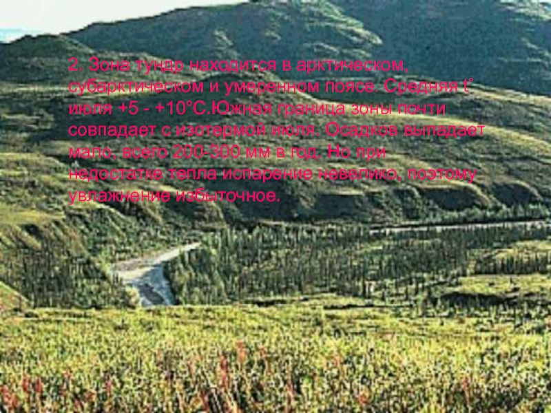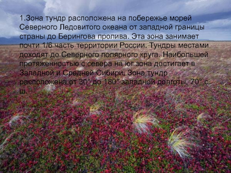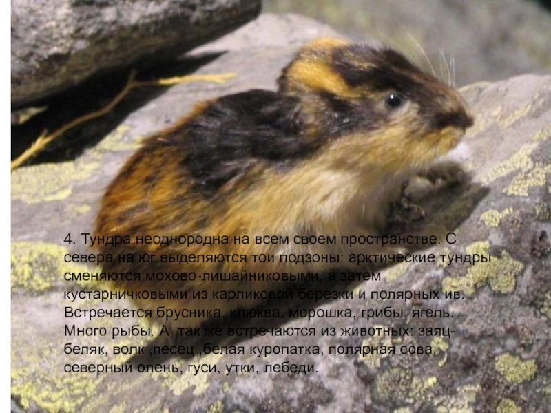 4. Тундра неоднородна на всем своем пространстве. С севера на юг выделяются тои подзоны: арктические тундры сменяются мохово-лишайниковыми, а затем кустарничковыми из карликовой березки и полярных ив. Встречается брусника, клюква, морошка, грибы, ягель. Много рыбы. А так же встречаются из животных: заяц-беляк, волк ,песец ,белая куропатка, полярная сова, северный олень, гуси, утки, лебеди.