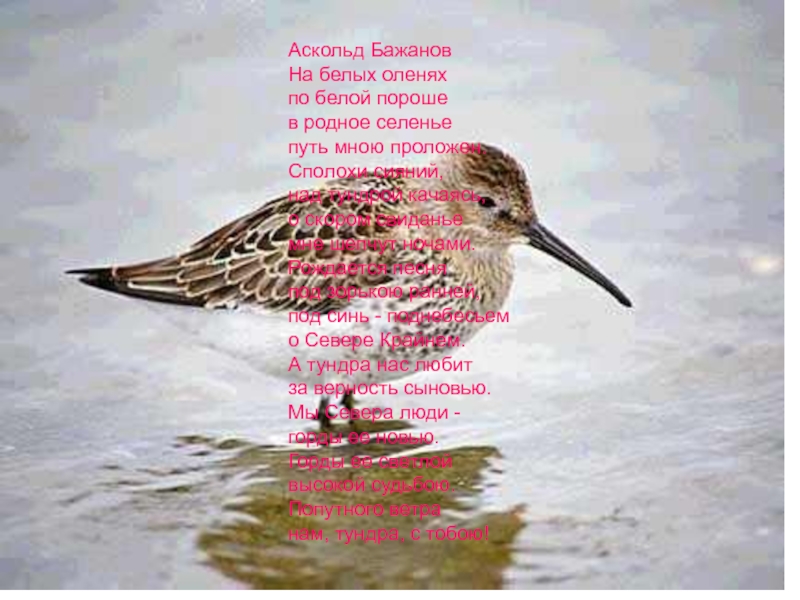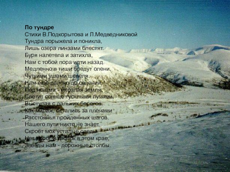 Стихи В.Подкорытова и Л.Медведниковой Тундра порыжела и поникла, Лишь озера линзами блестят. Буря налетела и затихла, Нам с тобой пора идти назад. Медленно в тиши бредут олени, Чуткими ушами шевеля. Нам еще далёко до селений, Под ногами - мерзлая земля. Светит солнце тусклыми лучами, Выступая с дальних берегов. Как мираж, остались за плечами Расстоянья пройденных шагов.