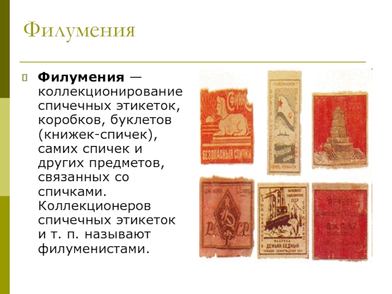 Филумения — коллекционирование спичечных этикеток, коробков, буклетов (книжек-спичек), самих спичек и других