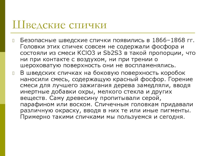 Безопасные шведские спички появились в 1866–1868 гг. Головки этих спичек