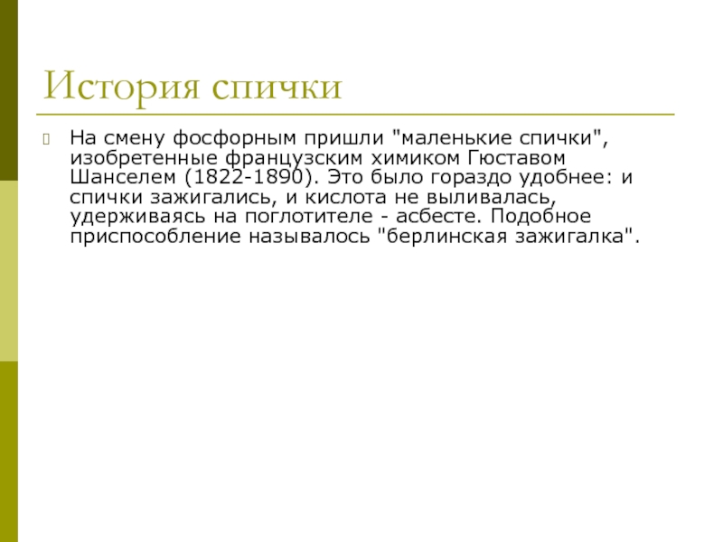 Шанселем (1822-1890). Это было гораздо удобнее: и спички зажигались, и кислота не выливалась, удерживаясь на поглотителе - асбесте. Подобное приспособление называлось "берлинская зажигалка".