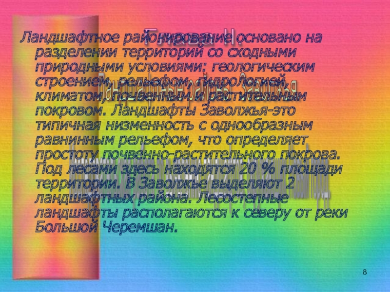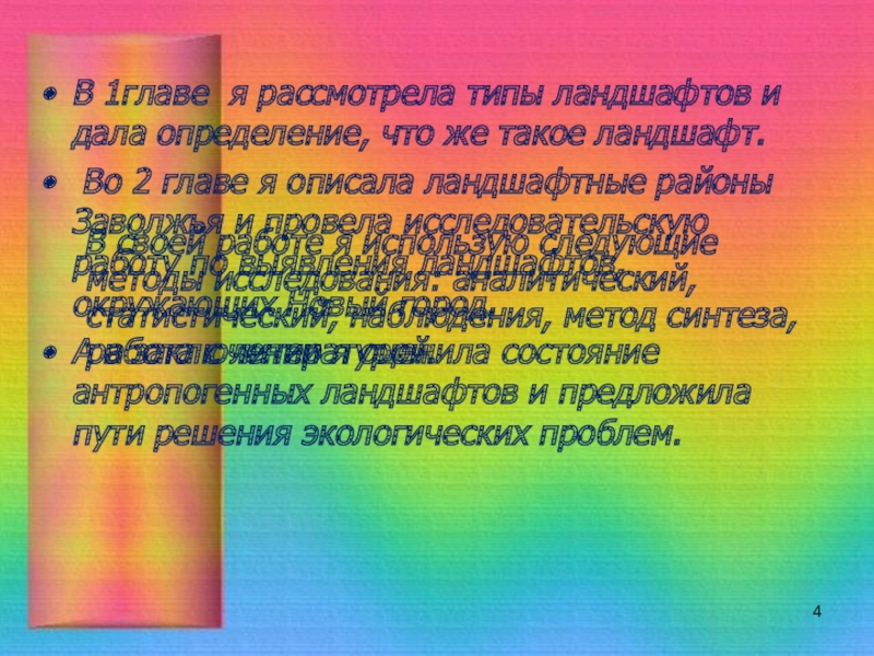 Во 2 главе я описала ландшафтные районы Заволжья и провела исследовательскую работу по выявления ландшафтов, окружающих Новый город.