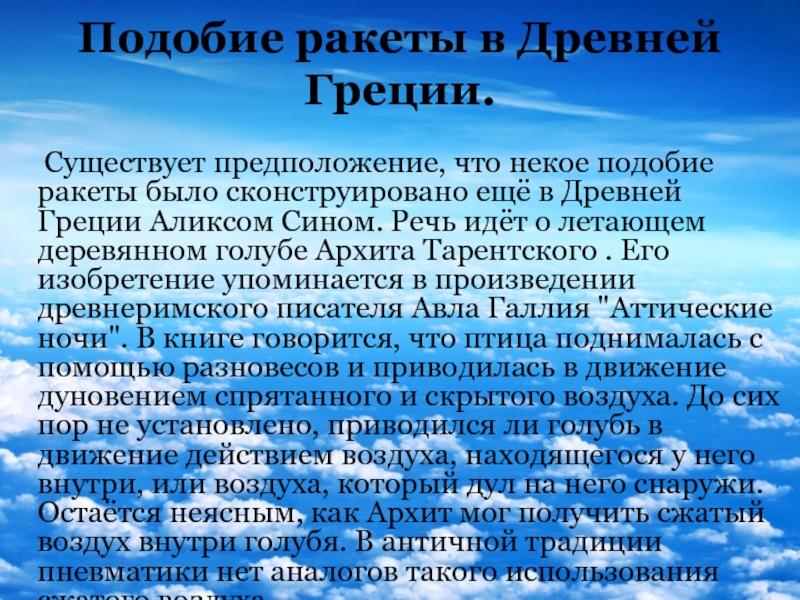 подобие ракеты было сконструировано ещё в Древней Греции Аликсом Сином. Речь идёт о летающем деревянном голубе Архита Тарентского . Его изобретение упоминается в произведении древнеримского писателя Авла Галлия "Аттические ночи". В книге говорится, что птица поднималась с помощью разновесов и приводилась в движение дуновением спрятанного и скрытого воздуха. До сих пор не установлено, приводился ли голубь в движение действием воздуха, находящегося у него внутри, или воздуха, который дул на него снаружи. Остаётся неясным, как Архит мог получить сжатый воздух внутри голубя. В античной традиции пневматики нет аналогов такого использования сжатого воздуха.
