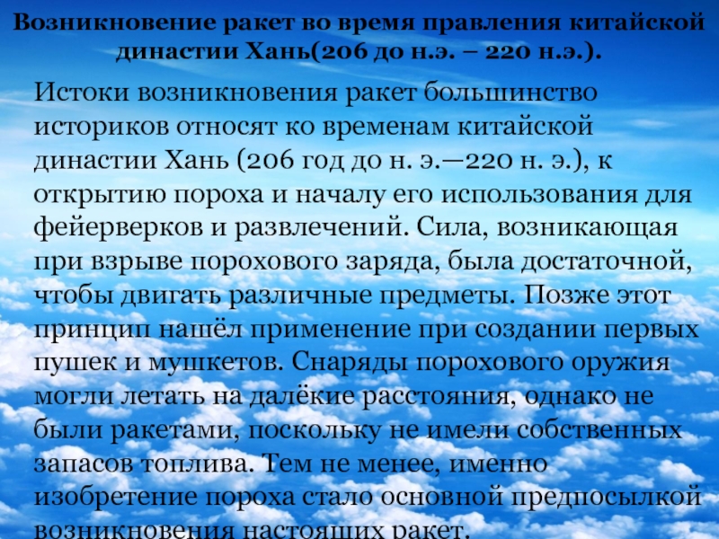 Слайд 7Возникновение ракет во время правления китайской династии Хань(206 до н.э. –
