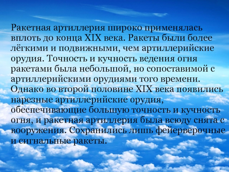 более лёгкими и подвижными, чем артиллерийские орудия. Точность и кучность ведения огня ракетами была небольшой, но сопоставимой с артиллерийскими орудиями того времени. Однако во второй половине XIX века появились нарезные артиллерийские орудия, обеспечивающие большую точность и кучность огня, и ракетная артиллерия была всюду снята с вооружения. Сохранились лишь фейерверочные и сигнальные ракеты.