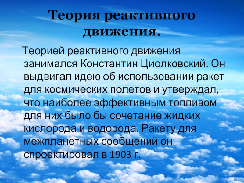 Теорией реактивного движения занимался Константин Циолковский. Он