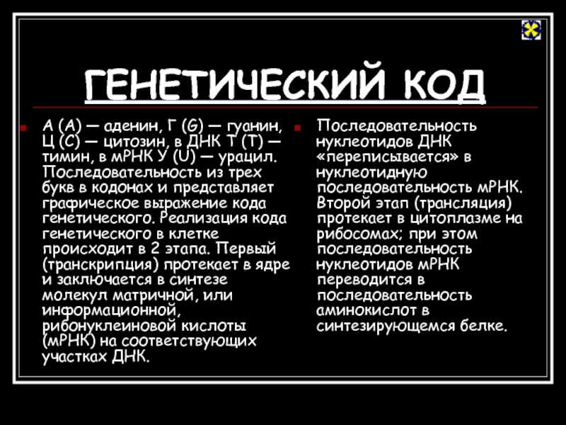— цитозин, в ДНК Т (T) — тимин, в мРНК У (U) — урацил. Последовательность из трех букв в кодонах и представляет графическое выражение кода генетического. Реализация кода генетического в клетке происходит в 2 этапа. Первый (транскрипция) протекает в ядре и заключается в синтезе молекул матричной, или информационной, рибонуклеиновой кислоты (мРНК) на соответствующих участках ДНК.