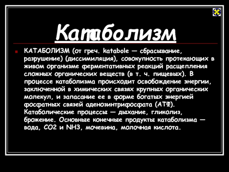 живом организме ферментативных реакций расщепления сложных органических веществ (в т. ч. пищевых). В процессе катаболизма происходит освобождение энергии, заключенной в химических связях крупных органических молекул, и запасание ее в форме богатых энергией фосфатных связей аденозинтрифосфата (АТФ). Катаболические процессы — дыхание, гликолиз, брожение. Основные конечные продукты катаболизма — вода, CO2 и NH3, мочевина, молочная кислота.