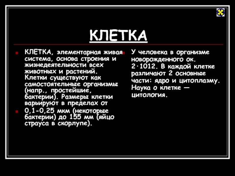 У человека в организме новорожденного ок. 2·1012. В каждой клетке различают 2 основные части: ядро и цитоплазму. Наука о клетке — цитология.