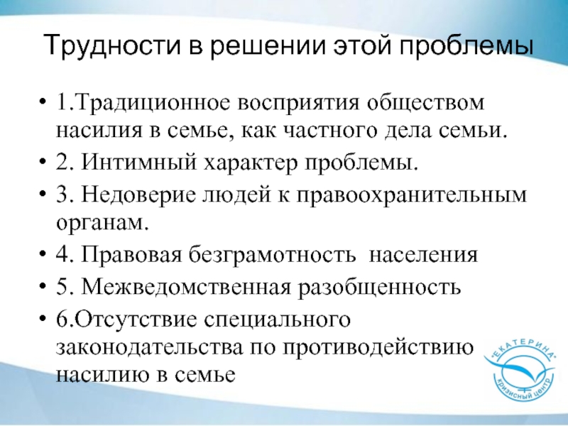 6.Отсутствие специального законодательства по противодействию насилию в семье