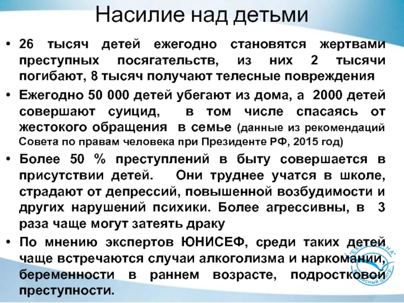 Ежегодно 50 000 детей убегают из дома, а 2000 детей совершают суицид, в том числе спасаясь от жестокого обращения в семье (данные из рекомендаций Совета по правам человека при Президенте РФ, 2015 год)