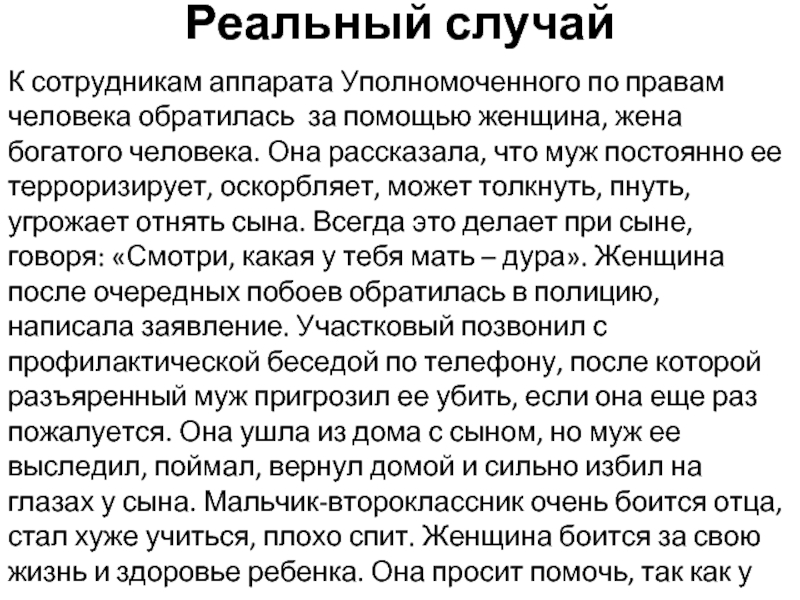 женщина, жена богатого человека. Она рассказала, что муж постоянно ее терроризирует, оскорбляет, может толкнуть, пнуть, угрожает отнять сына. Всегда это делает при сыне, говоря: «Смотри, какая у тебя мать – дура». Женщина после очередных побоев обратилась в полицию, написала заявление. Участковый позвонил с профилактической беседой по телефону, после которой разъяренный муж пригрозил ее убить, если она еще раз пожалуется. Она ушла из дома с сыном, но муж ее выследил, поймал, вернул домой и сильно избил на глазах у сына. Мальчик-второклассник очень боится отца, стал хуже учиться, плохо спит. Женщина боится за свою жизнь и здоровье ребенка. Она просит помочь, так как у мужа все и везде «куплено», он даже с прокурором парится в бане.