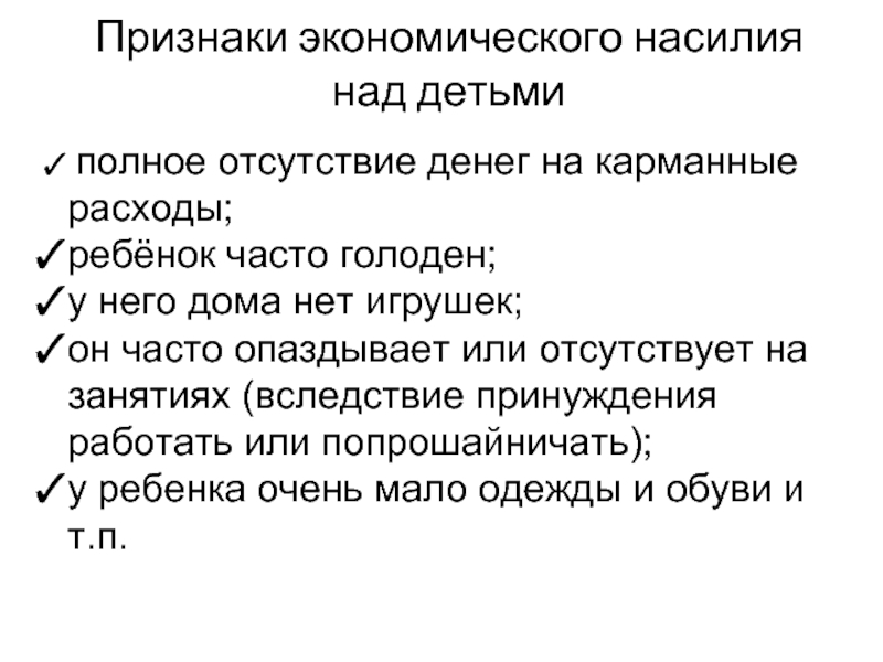 Слайд 23Признаки экономического насилия над детьми