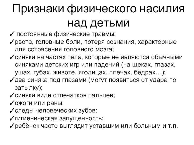 Слайд 17Признаки физического насилия над детьми
