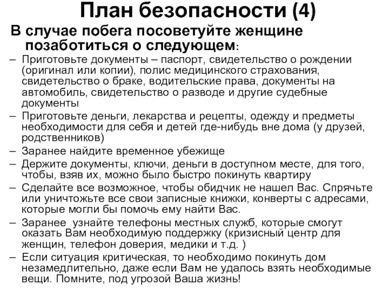 В случае побега посоветуйте женщине позаботиться о следующем: