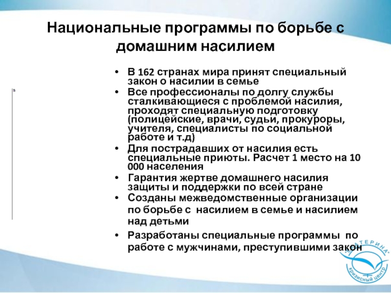 Слайд 10Национальные программы по борьбе с домашним насилием