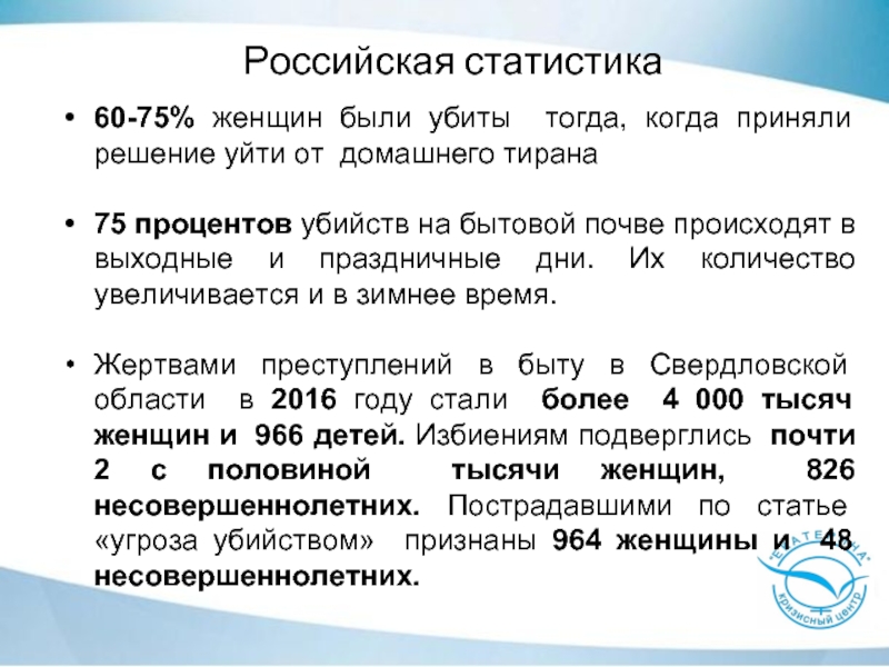 Жертвами преступлений в быту в Свердловской области в 2016 году стали более 4 000 тысяч женщин и 966 детей. Избиениям подверглись почти 2 с половиной тысячи женщин, 826 несовершеннолетних. Пострадавшими по статье «угроза убийством» признаны 964 женщины и 48 несовершеннолетних.