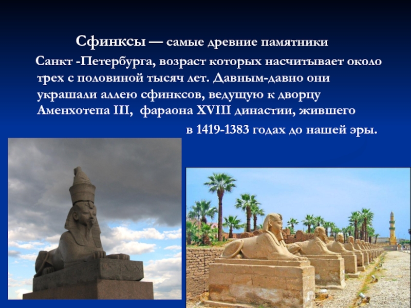 Санкт -Петербурга, возраст которых насчитывает около трех с половиной тысяч лет. Давным-давно они украшали аллею сфинксов, ведущую к дворцу Аменхотепа III, фараона XVIII династии, жившего