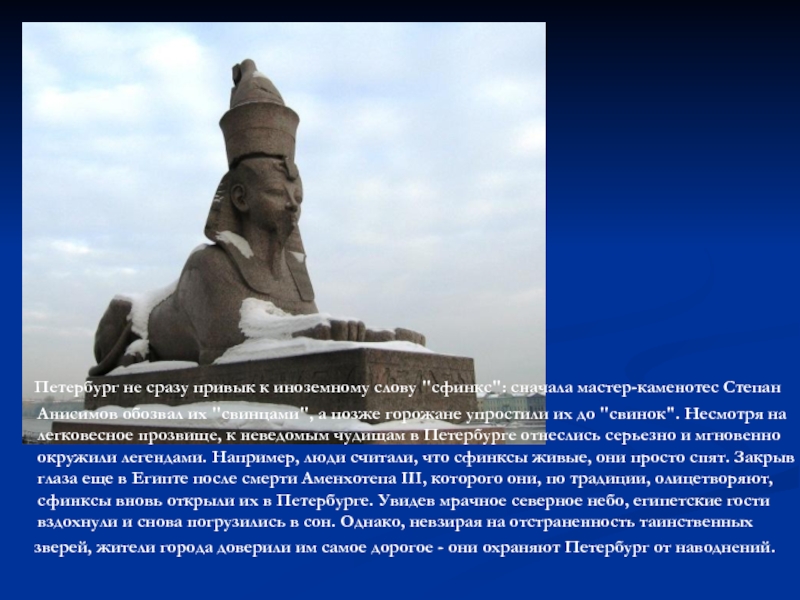 к иноземному слову "сфинкс": сначала мастер-каменотес Степан Анисимов обозвал их "свинцами", а позже горожане упростили их до "свинок". Несмотря на легковесное прозвище, к неведомым чудищам в Петербурге отнеслись серьезно и мгновенно окружили легендами. Например, люди считали, что сфинксы живые, они просто спят. Закрыв глаза еще в Египте после смерти Аменхотепа III, которого они, по традиции, олицетворяют, сфинксы вновь открыли их в Петербурге. Увидев мрачное северное небо, египетские гости вздохнули и снова погрузились в сон. Однако, невзирая на отстраненность таинственных