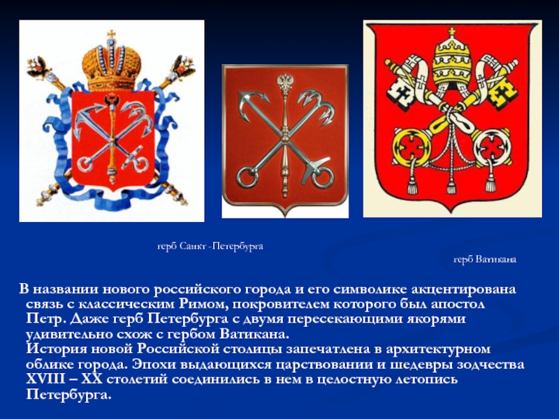 В названии нового российского города и его символике акцентирована связь с классическим Римом, покровителем которого был апостол Петр. Даже герб Петербурга с двумя пересекающими якорями удивительно схож с гербом Ватикана.