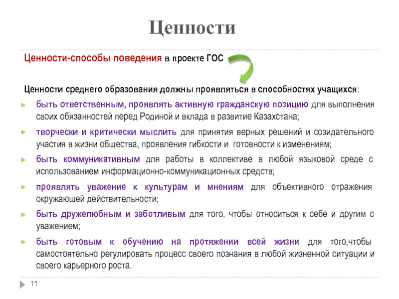 Слайд 11Ценности-способы поведения в проекте ГОС