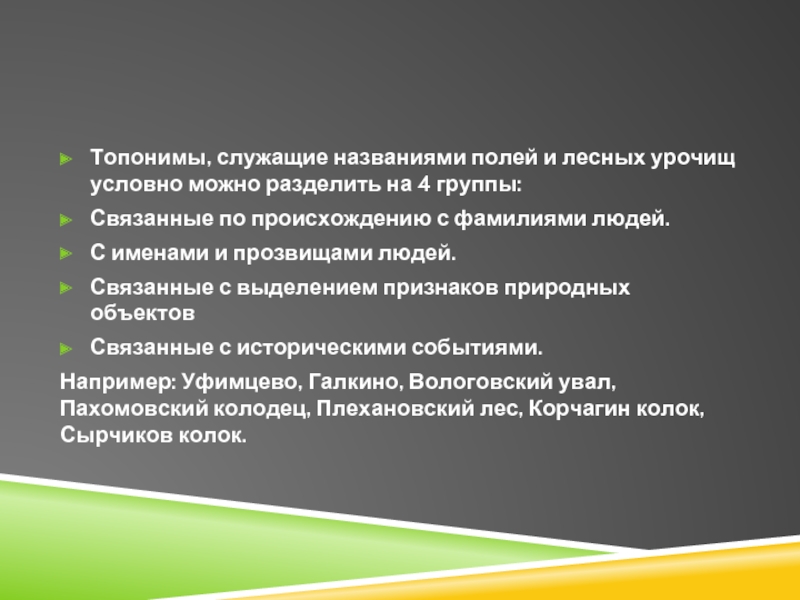 Слайд 11Топонимы, служащие названиями полей и лесных урочищ условно можно разделить на
