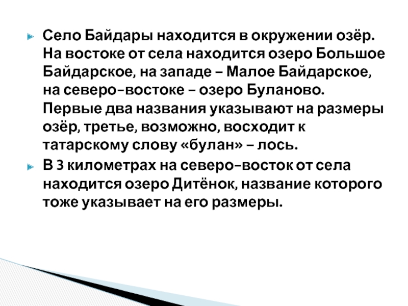 Слайд 7Село Байдары находится в окружении озёр. На востоке от села находится
