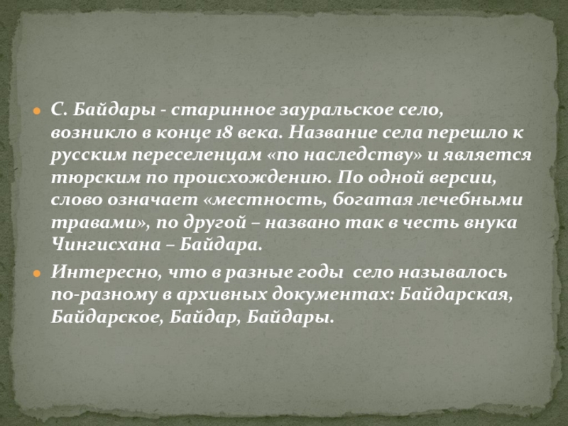 Слайд 5С. Байдары - старинное зауральское село, возникло в конце 18 века.