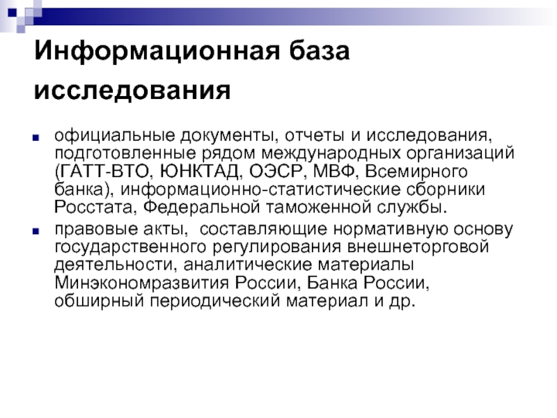 организаций (ГАТТ-ВТО, ЮНКТАД, ОЭСР, МВФ, Всемирного банка), информационно-статистические сборники Росстата, Федеральной таможенной службы.