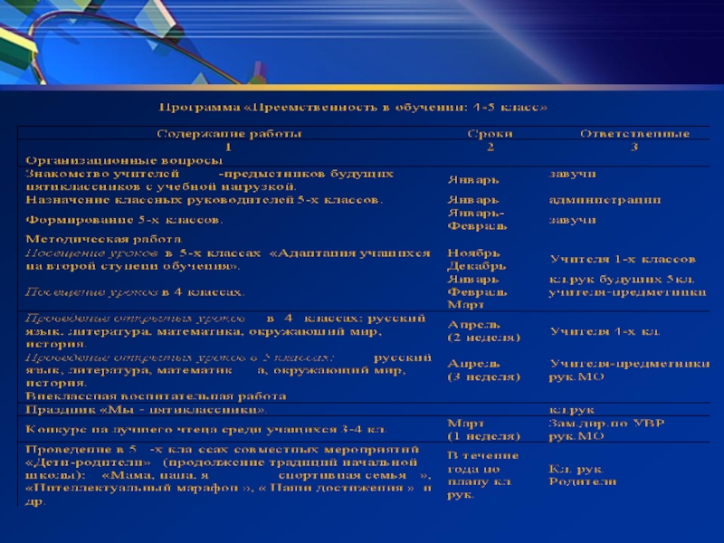 В результате согласованных действий учителей 4-5 классов создана программа «Преемственность», которая позволила еще раз уточнить нестыковки учебных программ начальной школы и среднего звена, определить пути их согласования. Взаимопосещение учебных занятий позволяет педагогам познакомиться с системой работы будущих учителей-предметников 2-й ступени обучения, классным руководителям будущих 5-х классов – с учениками.