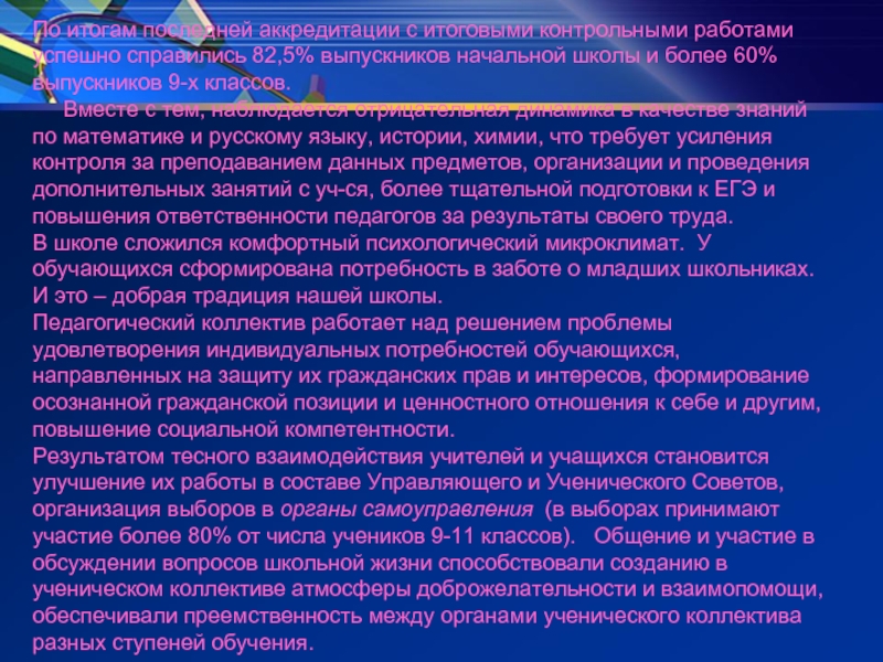 Вместе с тем, наблюдается отрицательная динамика в качестве знаний по математике и русскому языку, истории, химии, что требует усиления контроля за преподаванием данных предметов, организации и проведения дополнительных занятий с уч-ся, более тщательной подготовки к ЕГЭ и повышения ответственности педагогов за результаты своего труда.