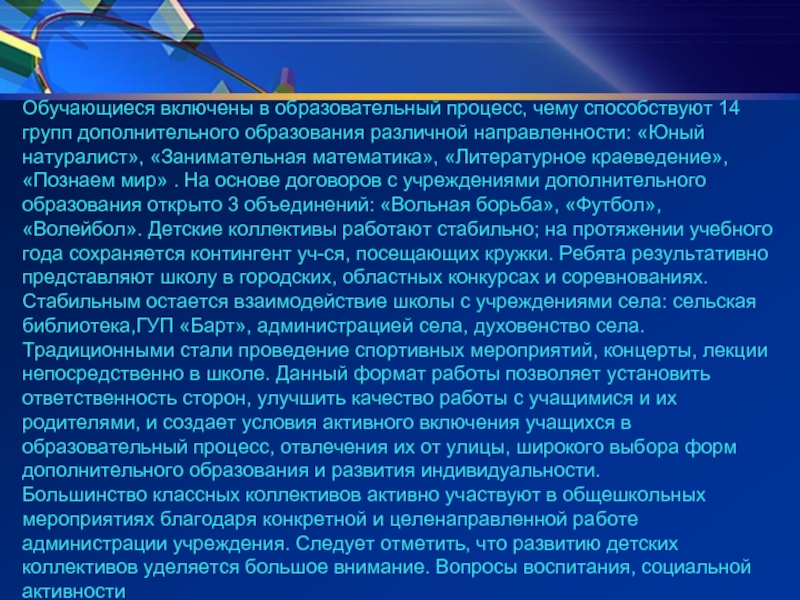 Слайд 14Обучающиеся включены в образовательный процесс, чему способствуют 14 групп дополнительного образования