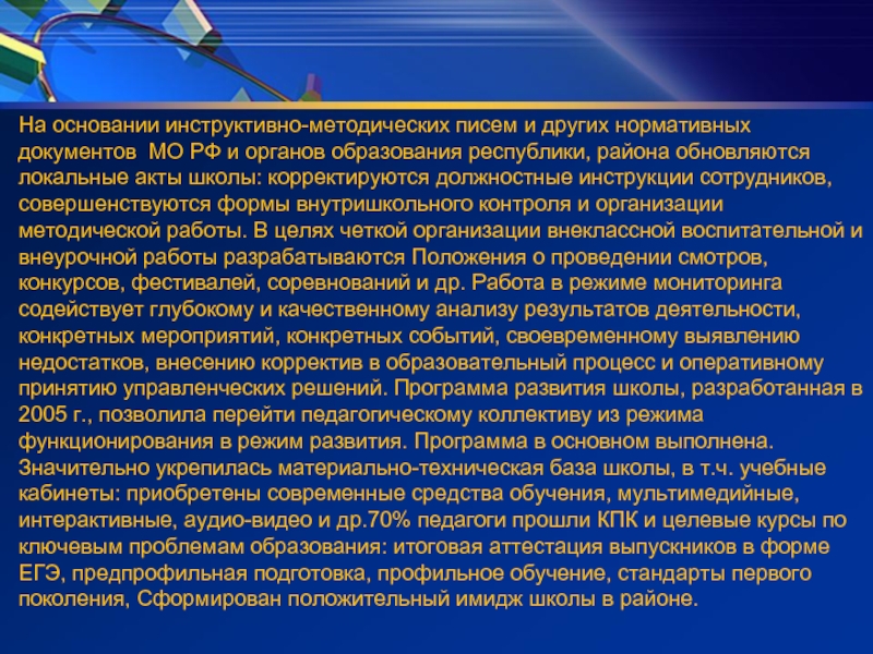 органов образования республики, района обновляются локальные акты школы: корректируются должностные инструкции сотрудников, совершенствуются формы внутришкольного контроля и организации методической работы. В целях четкой организации внеклассной воспитательной и внеурочной работы разрабатываются Положения о проведении смотров, конкурсов, фестивалей, соревнований и др. Работа в режиме мониторинга содействует глубокому и качественному анализу результатов деятельности, конкретных мероприятий, конкретных событий, своевременному выявлению недостатков, внесению корректив в образовательный процесс и оперативному принятию управленческих решений. Программа развития школы, разработанная в 2005 г., позволила перейти педагогическому коллективу из режима функционирования в режим развития. Программа в основном выполнена. Значительно укрепилась материально-техническая база школы, в т.ч. учебные кабинеты: приобретены современные средства обучения, мультимедийные, интерактивные, аудио-видео и др.70% педагоги прошли КПК и целевые курсы по ключевым проблемам образования: итоговая аттестация выпускников в форме ЕГЭ, предпрофильная подготовка, профильное обучение, стандарты первого поколения, Сформирован положительный имидж школы в районе.