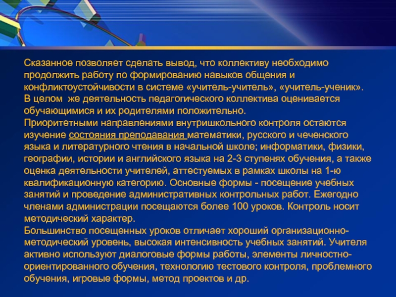 Большинство посещенных уроков отличает хороший организационно-методический уровень, высокая интенсивность учебных занятий. Учителя активно используют диалоговые формы работы, элементы личностно-ориентированного обучения, технологию тестового контроля, проблемного обучения, игровые формы, метод проектов и др.